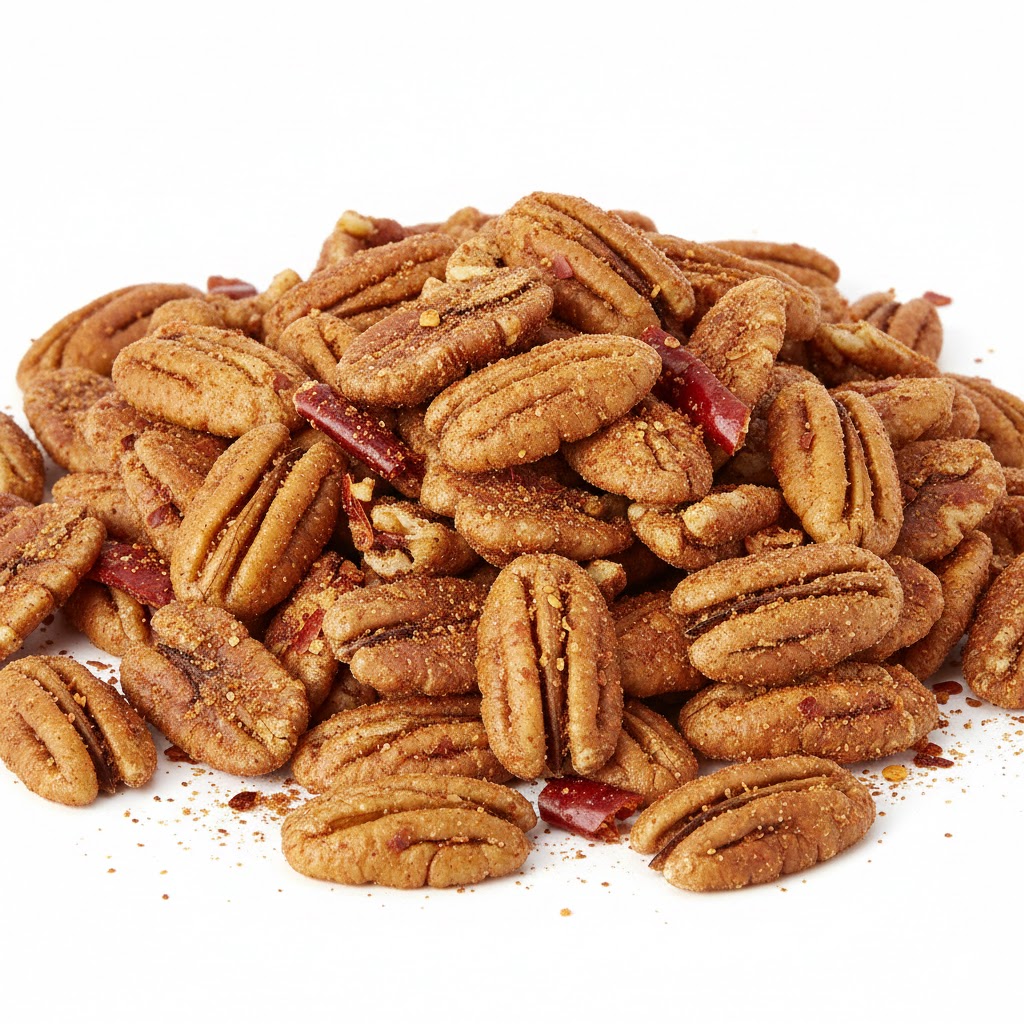 Cada pieza ha sido recubierta con una mezcla artesanal de chiles secos y especias que realzan su sabor natural sin opacarlo. El resultado es una experiencia gourmet: un primer impacto especiado que da paso a la textura cremosa y mantecosa característica de la nuez fresca.